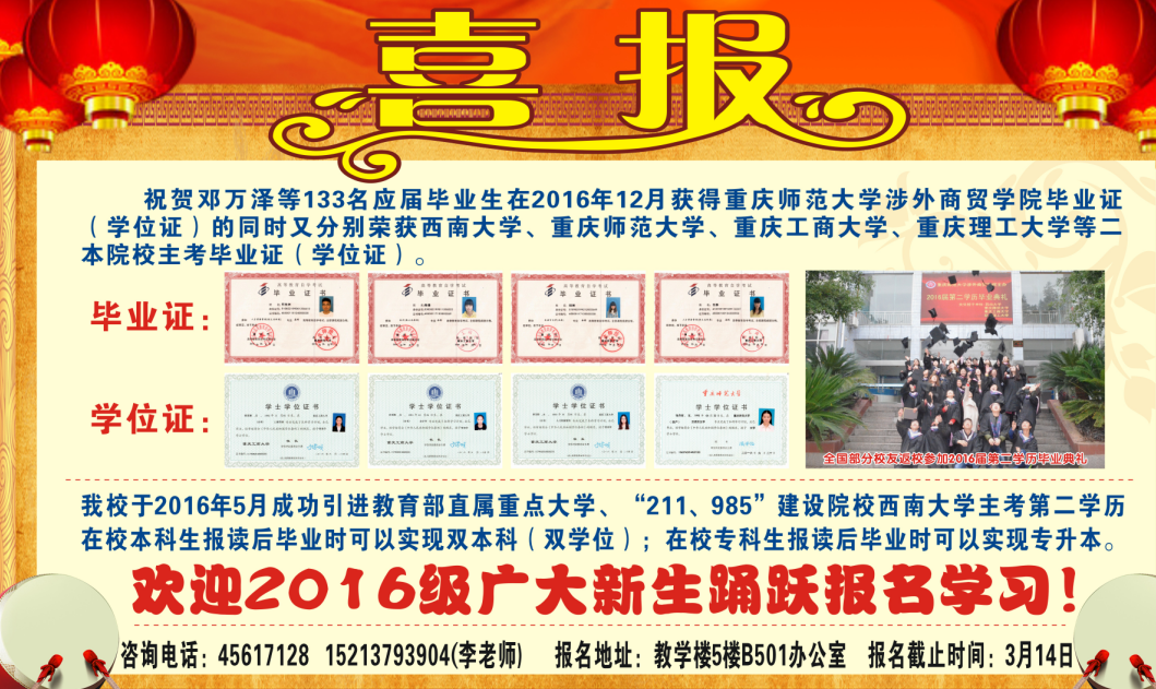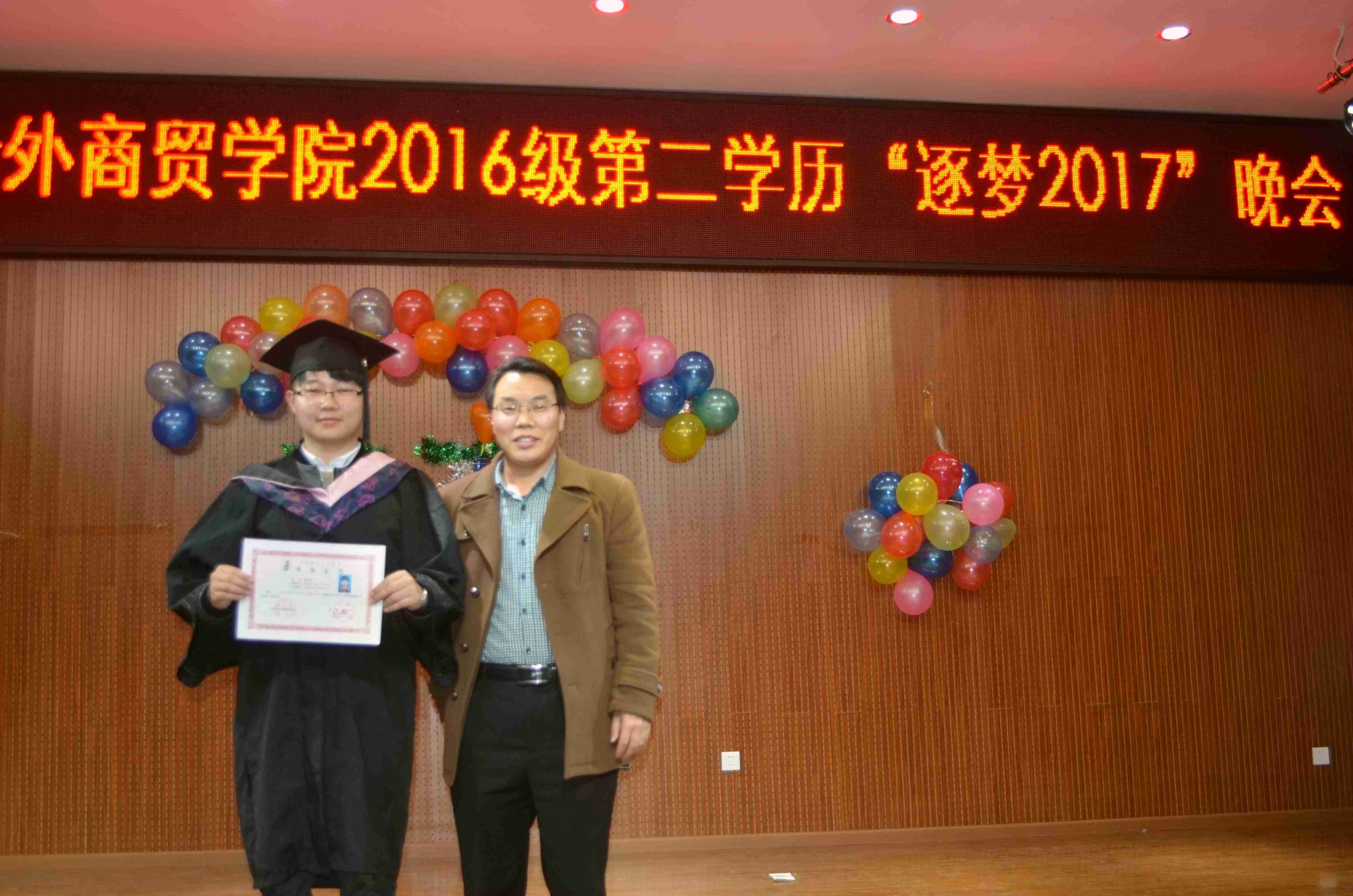 在铜梁校区3月9日举办的第二学历“逐梦2017”晚会上,我院领导还专门为2016届第二学历优秀毕业生代表邓万泽同学颁发了第二学历毕业文凭,借此机会祝愿我院第二学历毕业生前程似锦、一帆风顺,希望第二学历助推校友们实现自己的人生梦想。(双学历教育办公室 供稿)