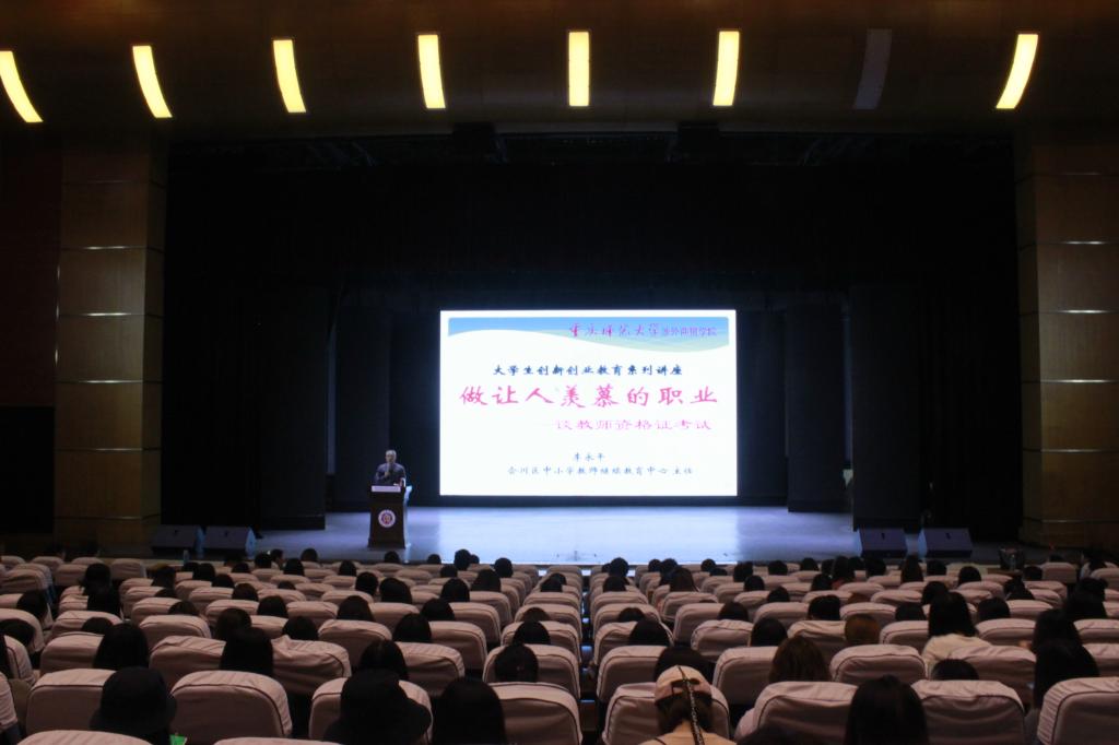 【本网讯】根据《重庆市中小学教师资格考试改革试点工作实施细则(试行)的通知》(渝教师〔2015〕21号)文件规定,我校师范生将在2018下半年迎来首次教师资格国考。为提前做好该项工作,我校教师资格考试培训中心分别于3月8日、3月15日联合合川区教委、合川区教师进修校、合川区中小学教师继续教育中心,邀请有关专家,分别针对合川和铜梁两个校区针对2016级(1552人)、2017级师范专业(1518人)总人数为3070人集中开展了教师资格国考政策宣讲。通过本次“全覆盖”宣讲活动,使广大师范生有了明晰的教师资格国考备考经验和专业职业生涯规划,这将有效提升我校师范生的国考认证率。